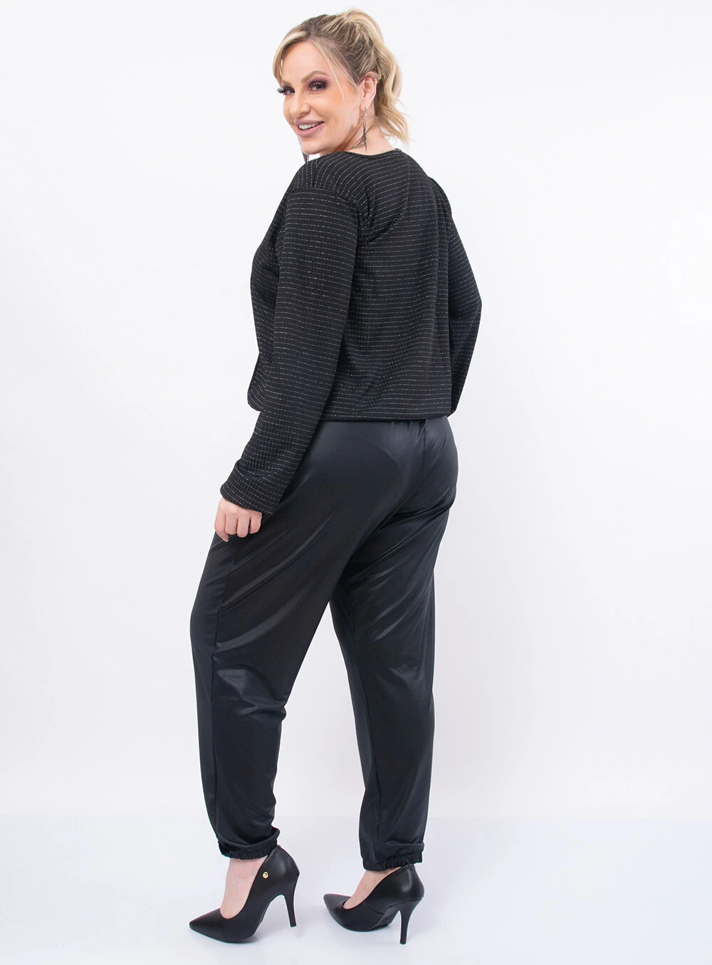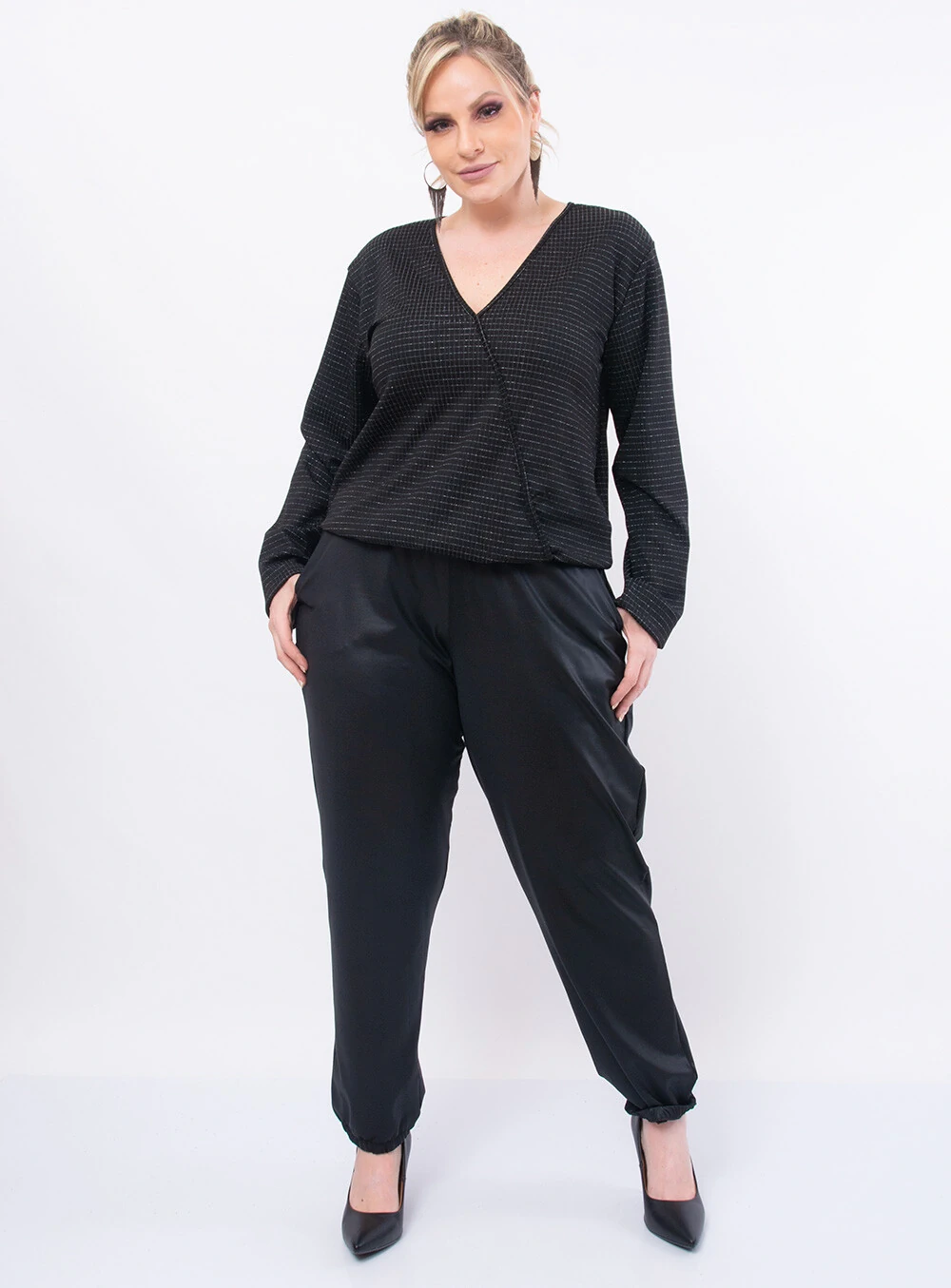 Blusa Plus Size Brilhante Botões Pedrarias em Crepe Lurex