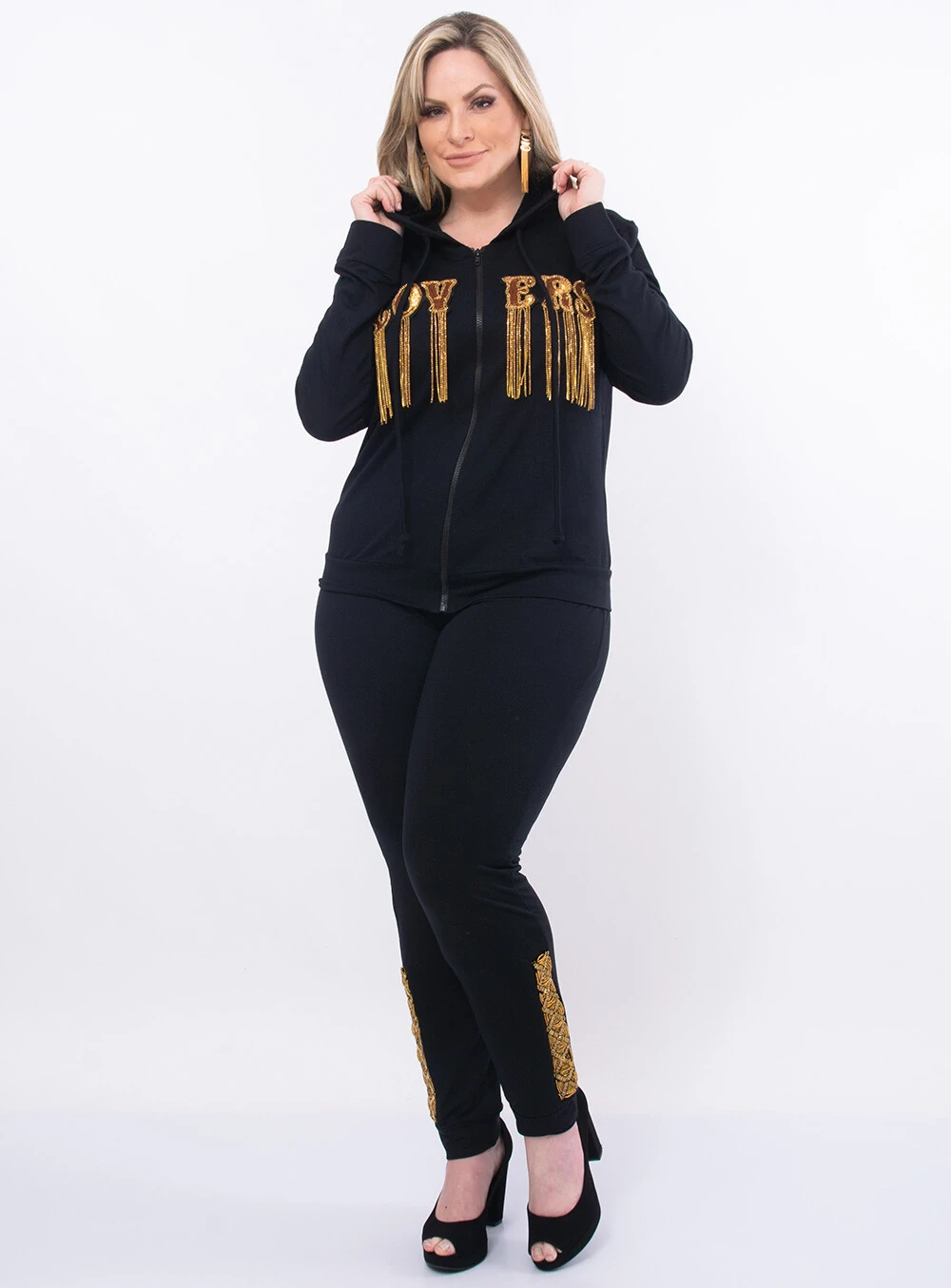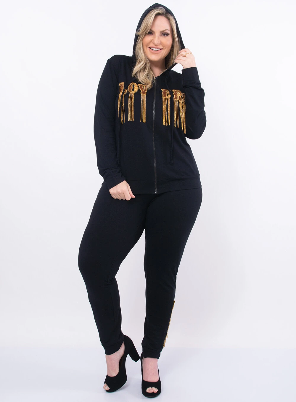 Modelo formado por casoco e calça jogger com aplicação em pedrarias.
