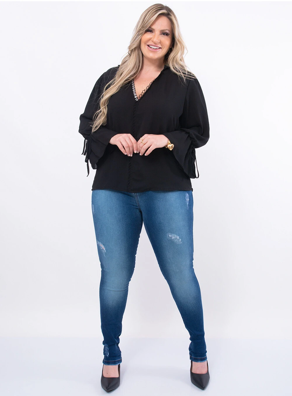 Mangas 7/8 com elástico e acabamento em laço com babado.