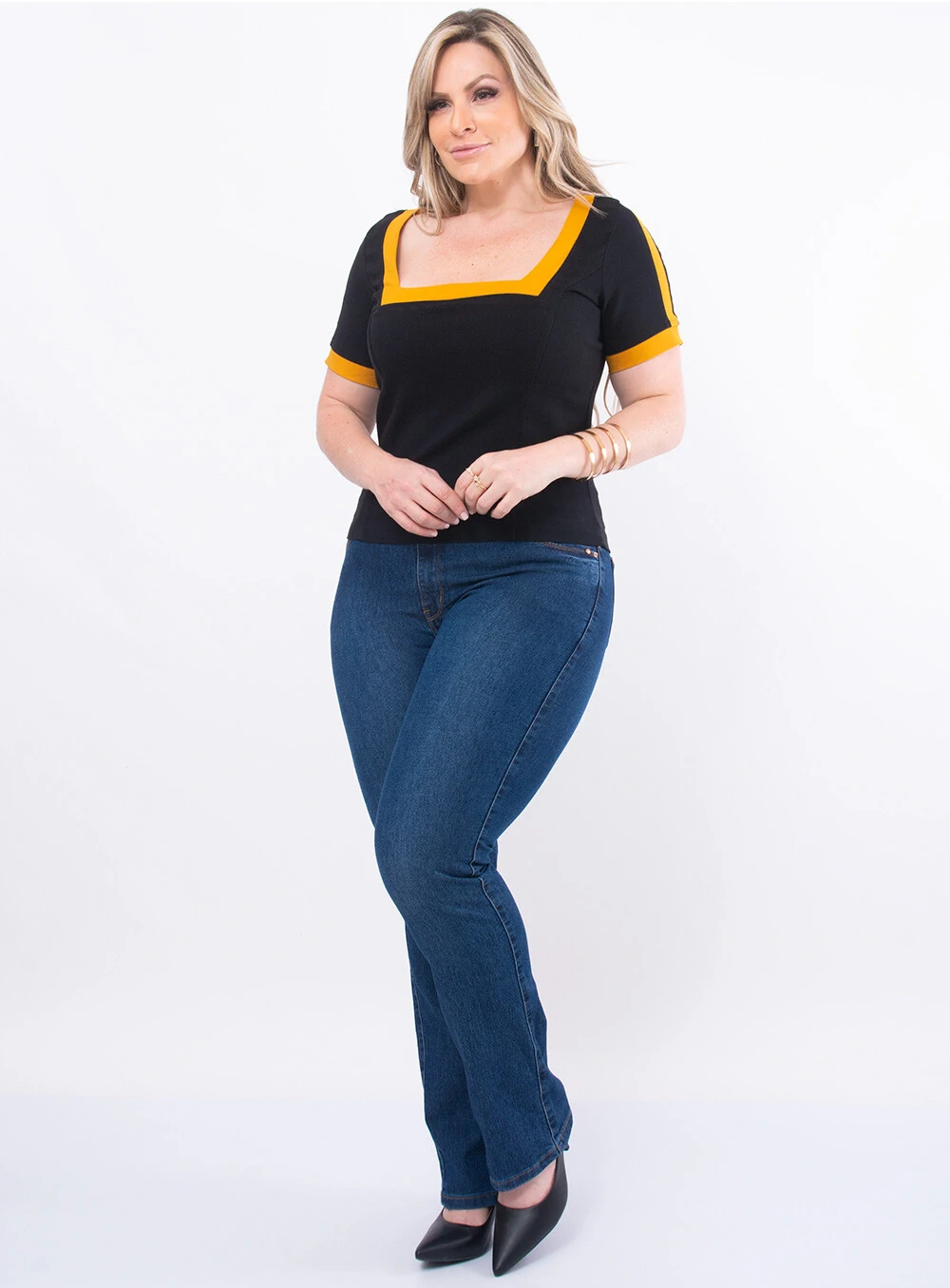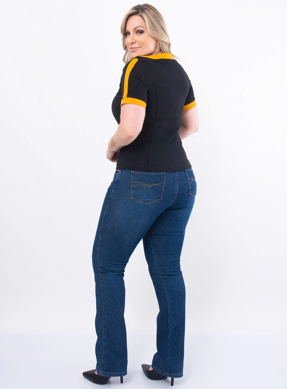 Detalhe nas mangas, gola e ombro na cor laranja.