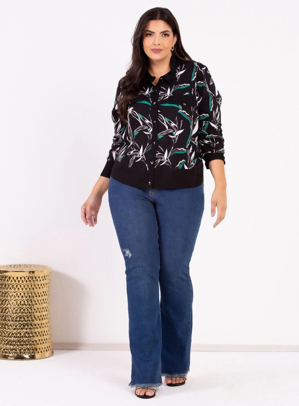 Calça Flare Plus Size Jeans com Elastano Faixa Trançada