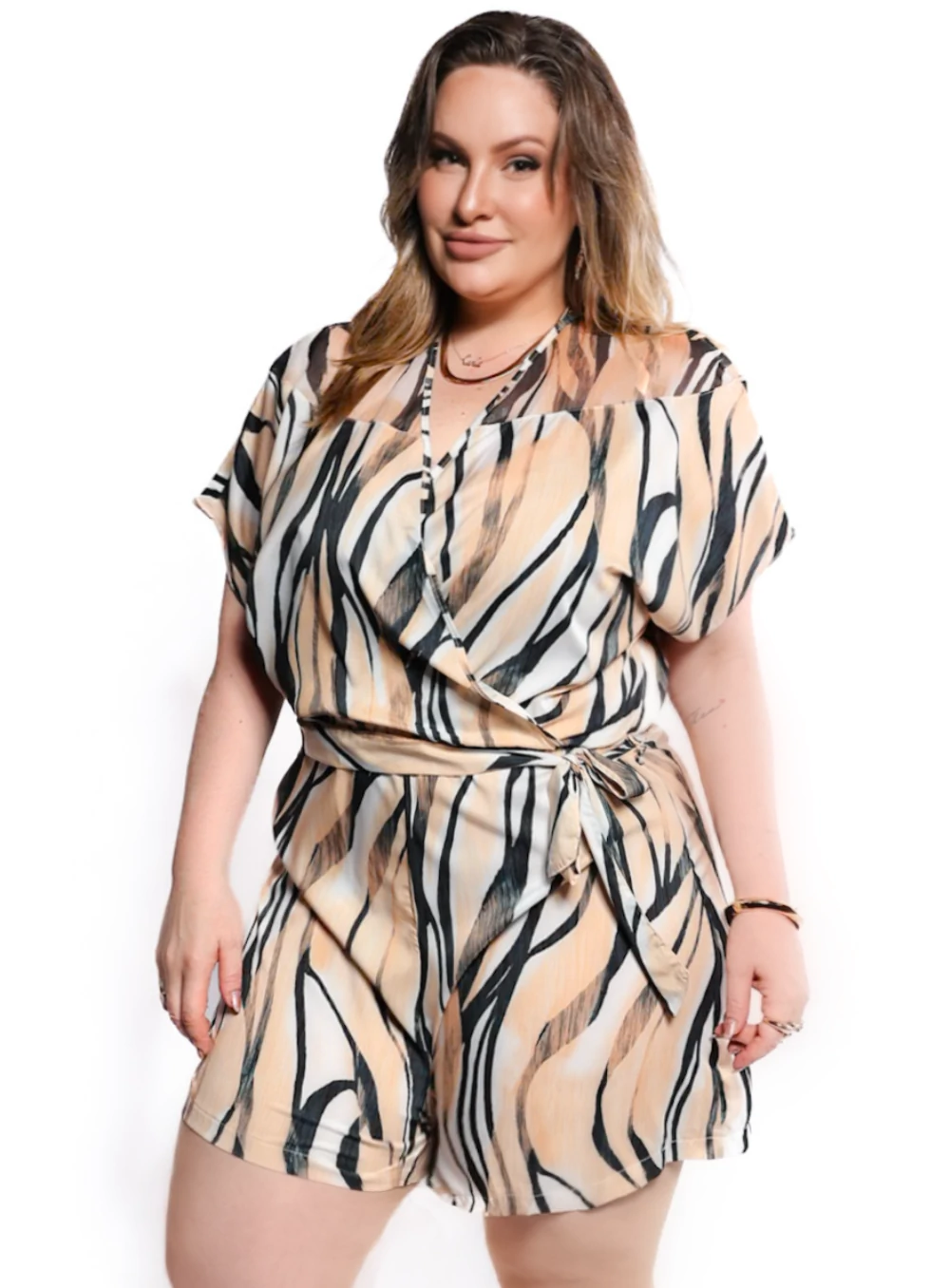 -15%Macaquinho curto plus size transpassado com faixa em crepe viscose
