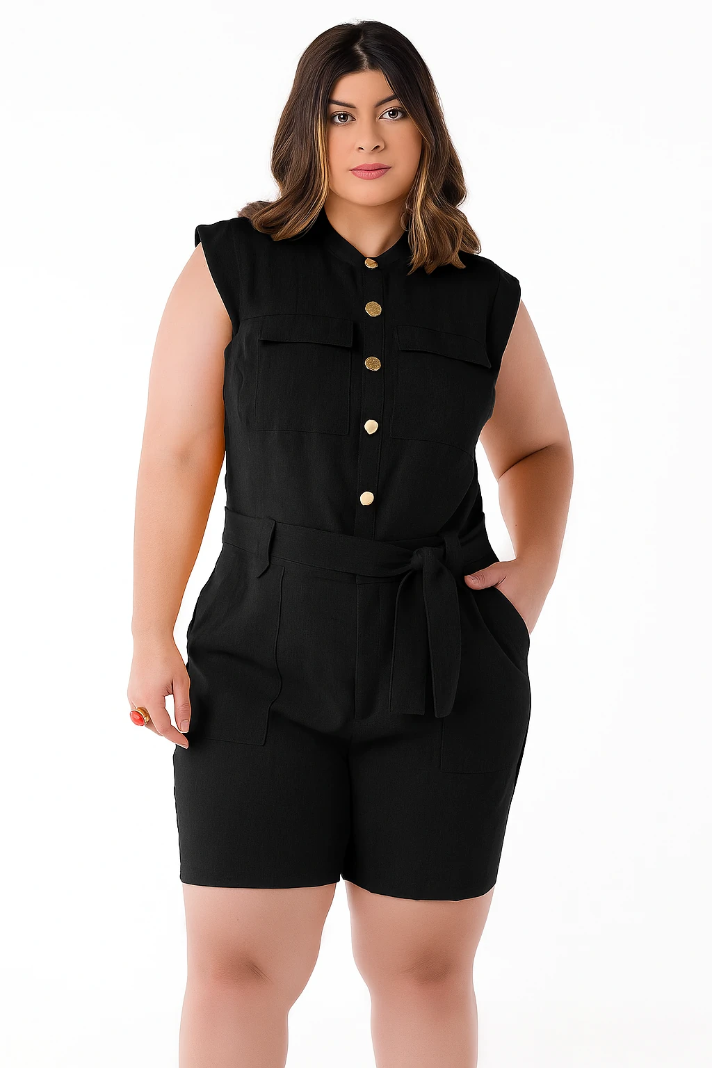 Macaquinho Curto Plus Size Pespontado com Bolsos em Tencel