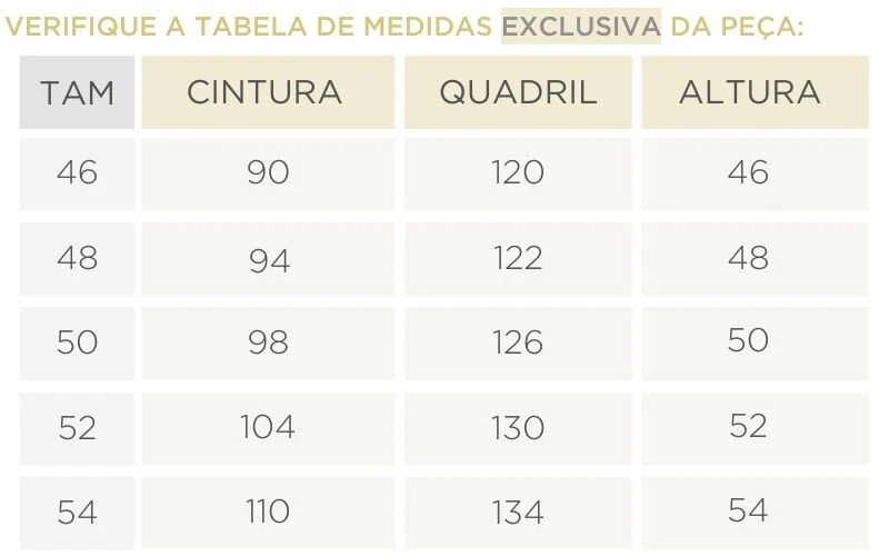 A modelo veste 48 e tem as seguintes medidas: 1,70 m de altura, 110 cm de busto, 90 cm de cintura, 125 cm de quadril, 66 cm de circunferência de coxa e 34 cm de circunferência de braço.