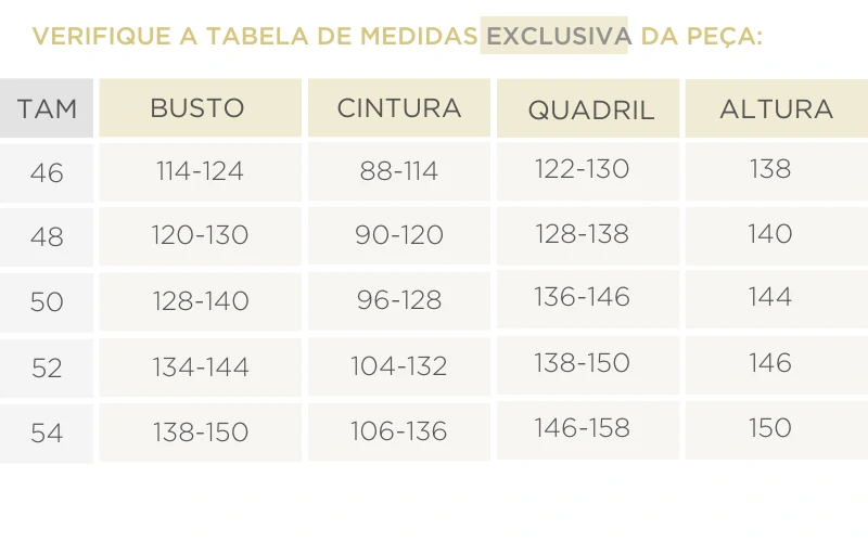 Possui forro até o final da coxa, pregas nos ombros para melhor caimento e elástico na cintura.