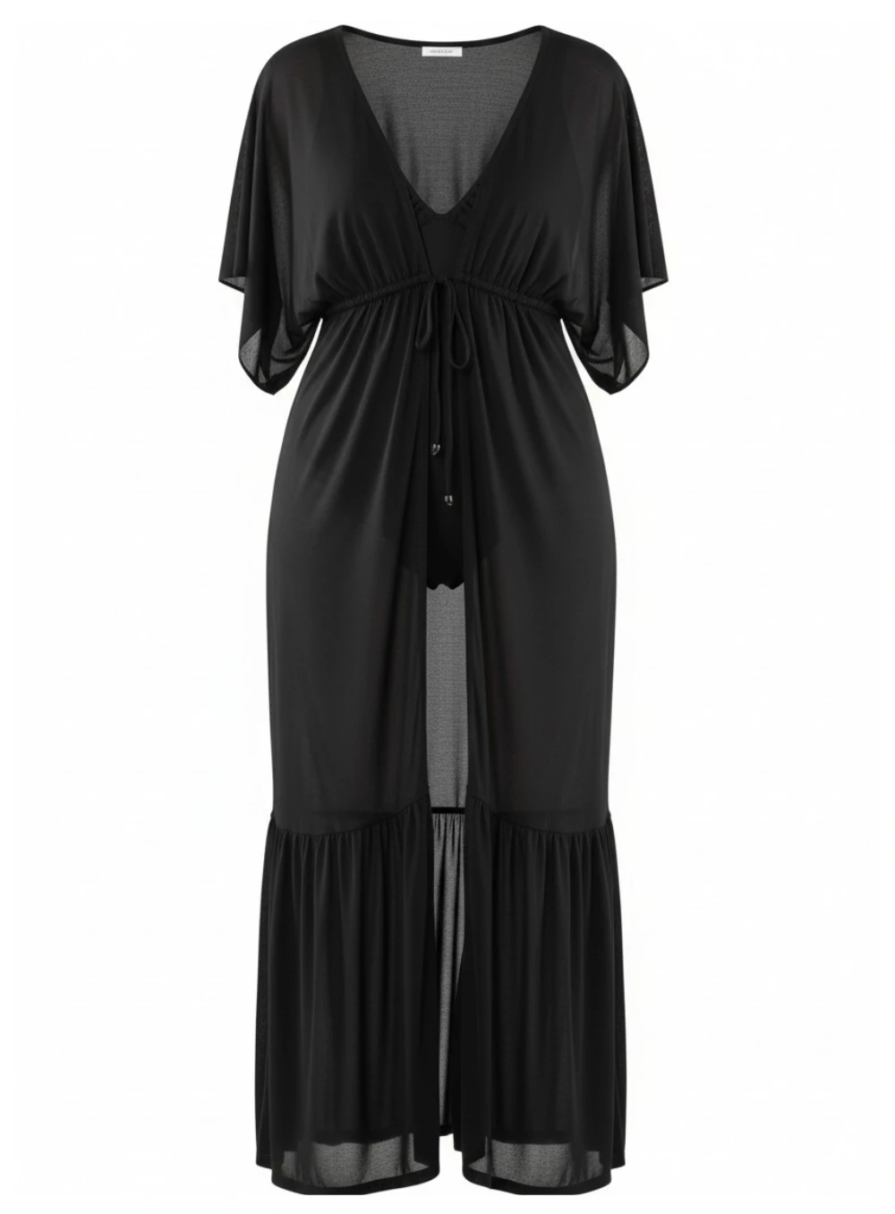 Saída de Praia Longa Plus Size Babados e Amarração na Cintura em Microtule