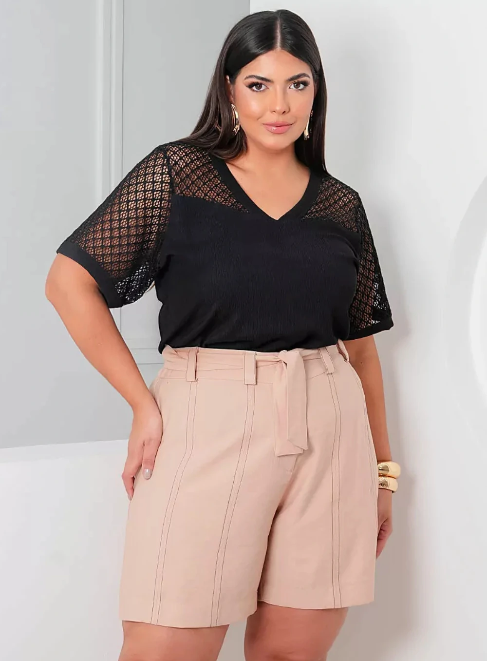Se você procura uma peça coringa, que une estilo, conforto e um toque sofisticado, essa blusa plus size preta é a escolha ideal! Com design moderno em malha crepe texturizada e detalhes de tela nas mangas, ela traz leveza e feminilidade, sem perder a versatilidade que o preto oferece.