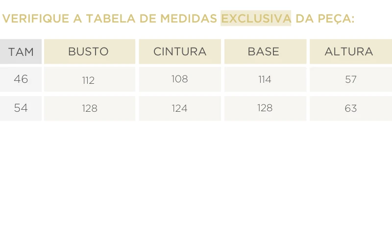 112 cm de busto, 108 cm de cintura, 114 cm de quadril e 57 cm de altura
