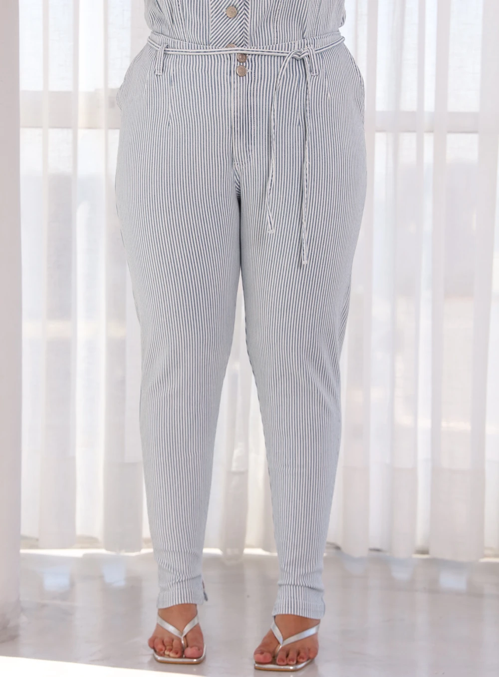 Confeccionada em tecido leve e macio com elastano, ela oferece mobilidade e caimento impecável. As listras finas verticais alongam a silhueta, adicionando um ar clássico e atemporal à peça — perfeita para composições casuais e sociais. 💙