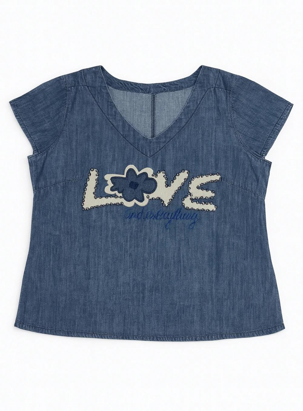A Blusa Plus Size Love Manga Curta com Aplicações é a peça perfeita para quem ama unir conforto, estilo e um toque de romantismo. Feita em jeans leve e super macio, ela traz um visual moderno e descolado, sem abrir mão da feminilidade.
