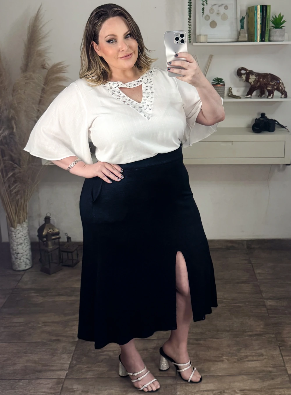 O grande destaque fica por conta do decote trabalhado com bordados delicados e aplicações brilhosas, que criam um efeito glam irresistível e valorizam naturalmente o colo. As mangas soltinhas trazem elegância e conforto, contribuindo para um caimento impecável no corpo plus size. 💎✨