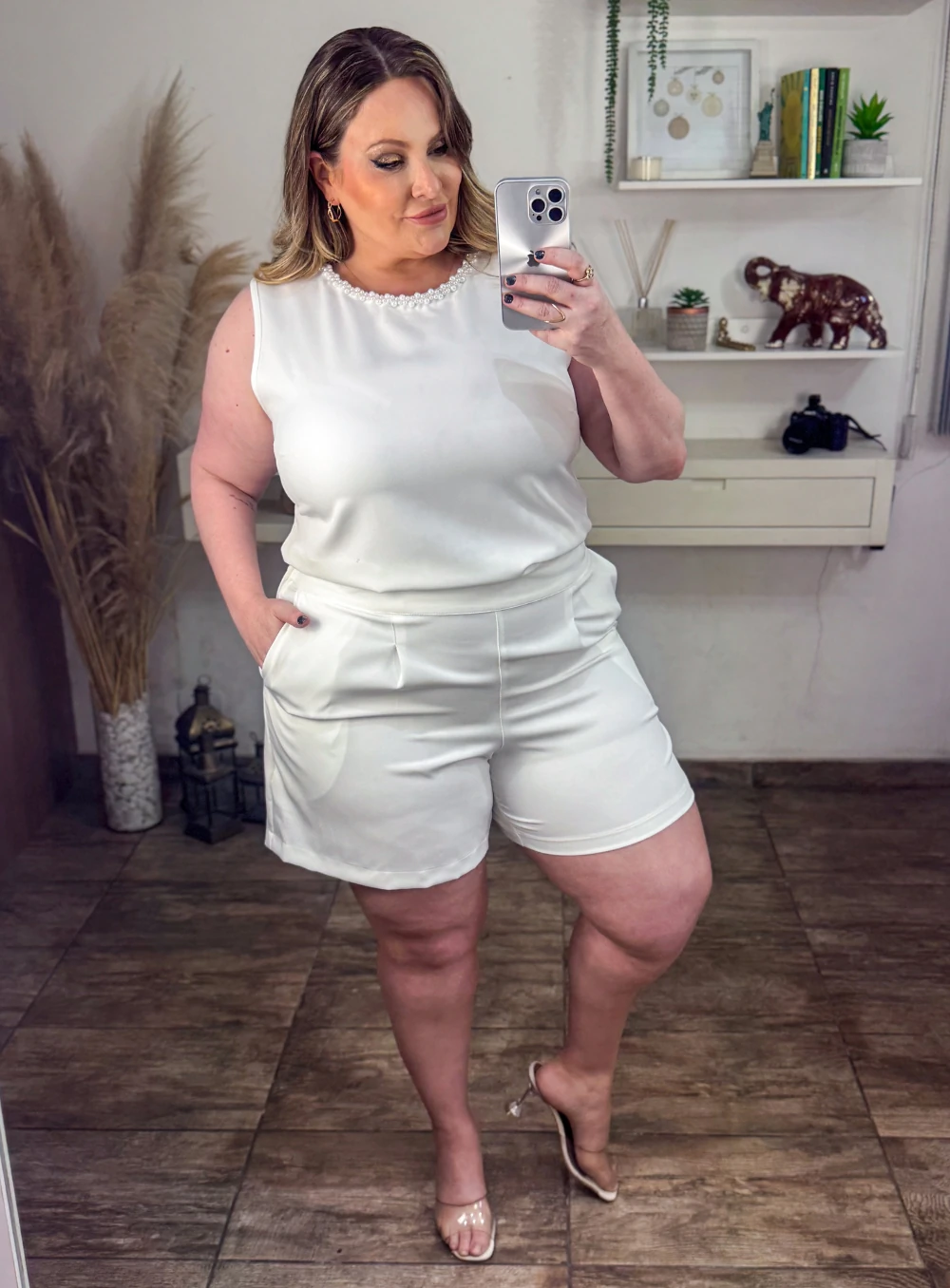 A blusa possui modelagem reta sofisticada, com decote redondo decorado por um bordado artesanal em pérolas, que adiciona um toque de glamour ao visual. Já o short vem com cós com elástico na parte de trás, que garante ajuste perfeito ao corpo plus size, além de um caimento impecável e atemporal.