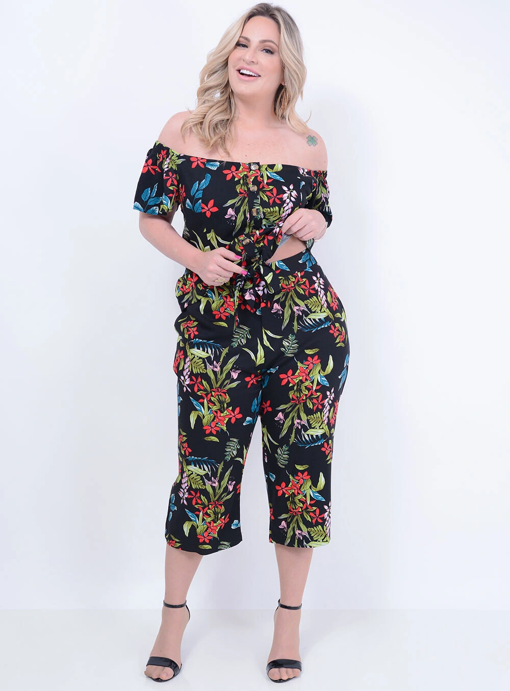 Conjunto de blusa e calça pantacourt em viscose, estampa de folhagens com floral.