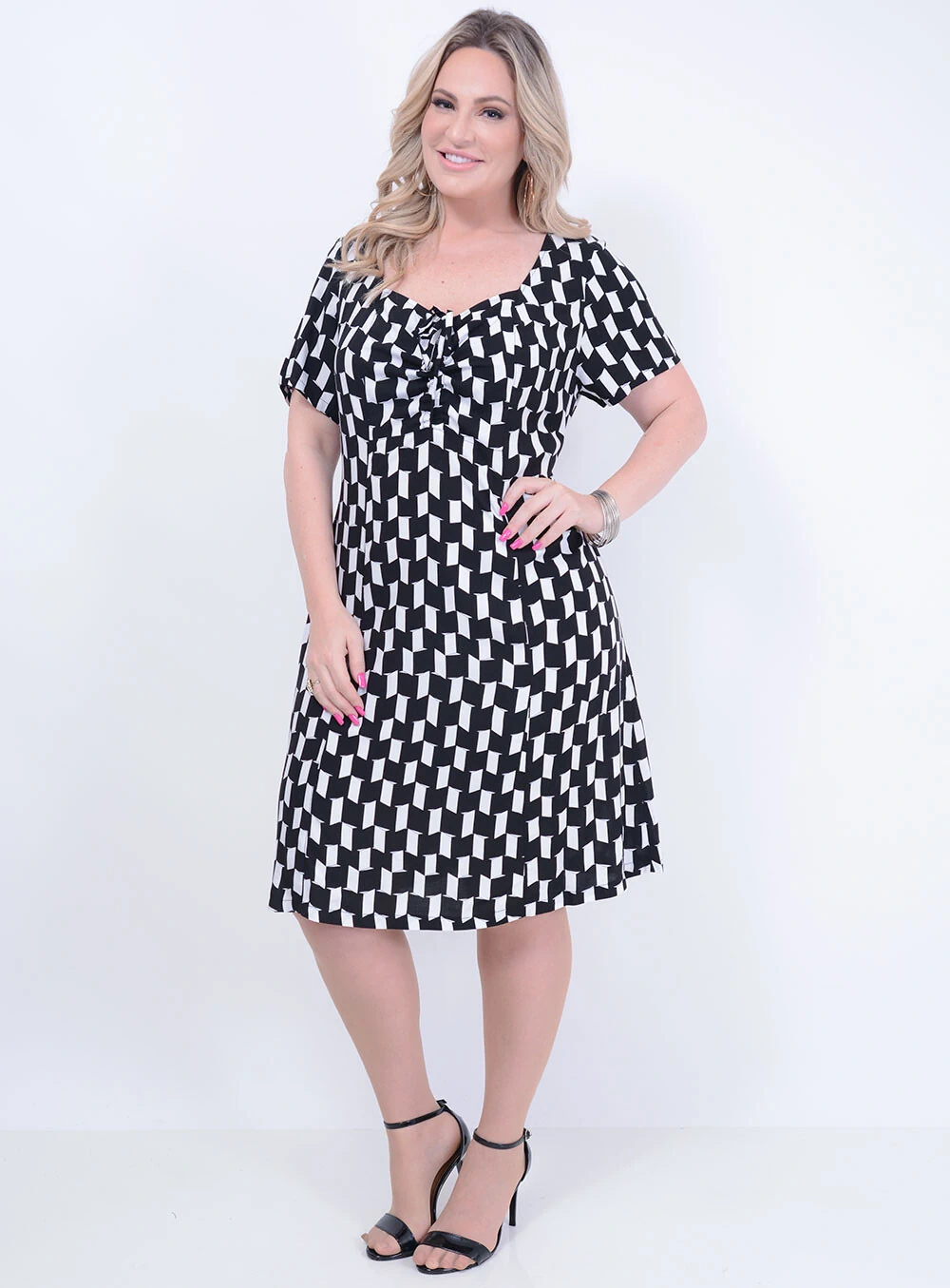 Vestido em viscose. Possui mangas curtas, decote princesa com detalhe franzido e amarração e fechamento por amarração na parte traseira com recorte e zíper invisível. Estampa geométrica.