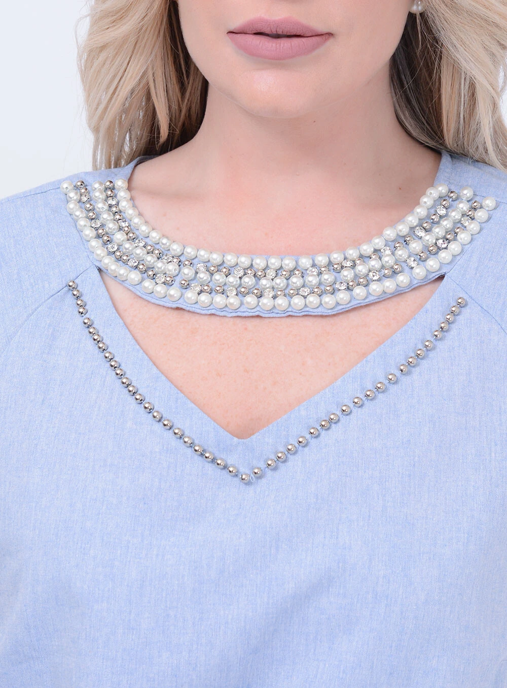 Calça Jeans Plus Size Skinny Bordados de Pedrarias Frontais com Elastano