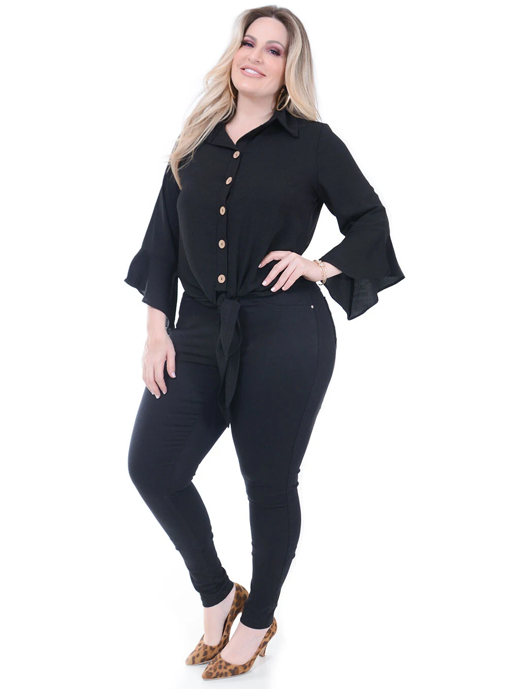 Blusa Plus Size Recorte no Decote Botões na Gola em Crepe