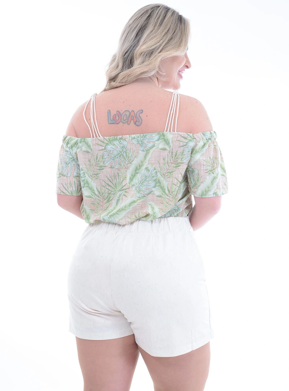 Modelo veste 46 e tem as seguintes medidas: Altura 1,70m - Busto 105cm - Cintura 88cm - Quadril 120cm - Circunferência da coxa: 74cm - Circunferência do braço: 34 cm