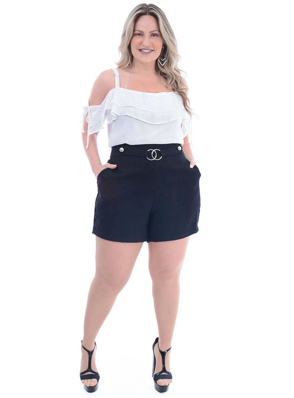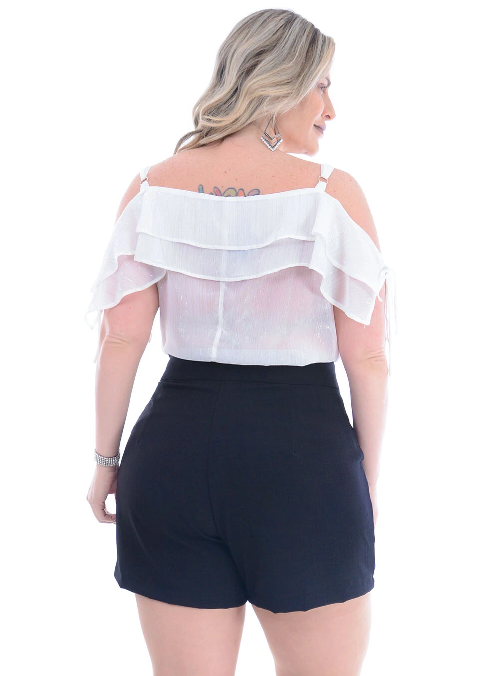 Modelo veste 46 e tem as seguintes medidas: Altura 1,70m - Busto 105cm - Cintura 88cm - Quadril 120cm - Circunferência da coxa: 74cm - Circunferência do braço: 34 cm.