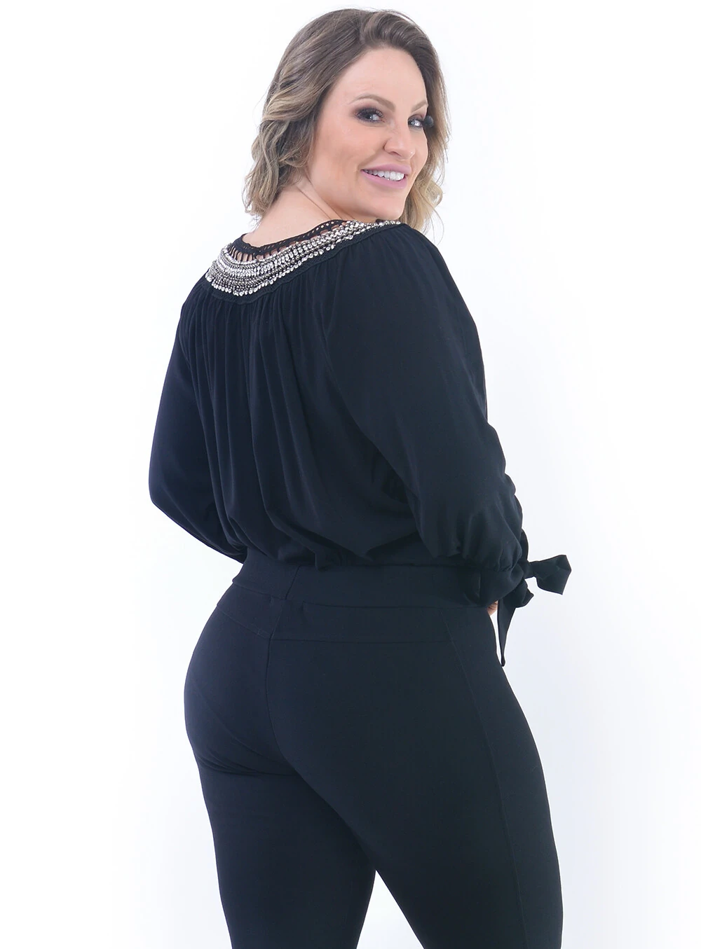 Regata Evasê Plus Size Cetim com Renda Barra Assimétrica – Preto e Branco