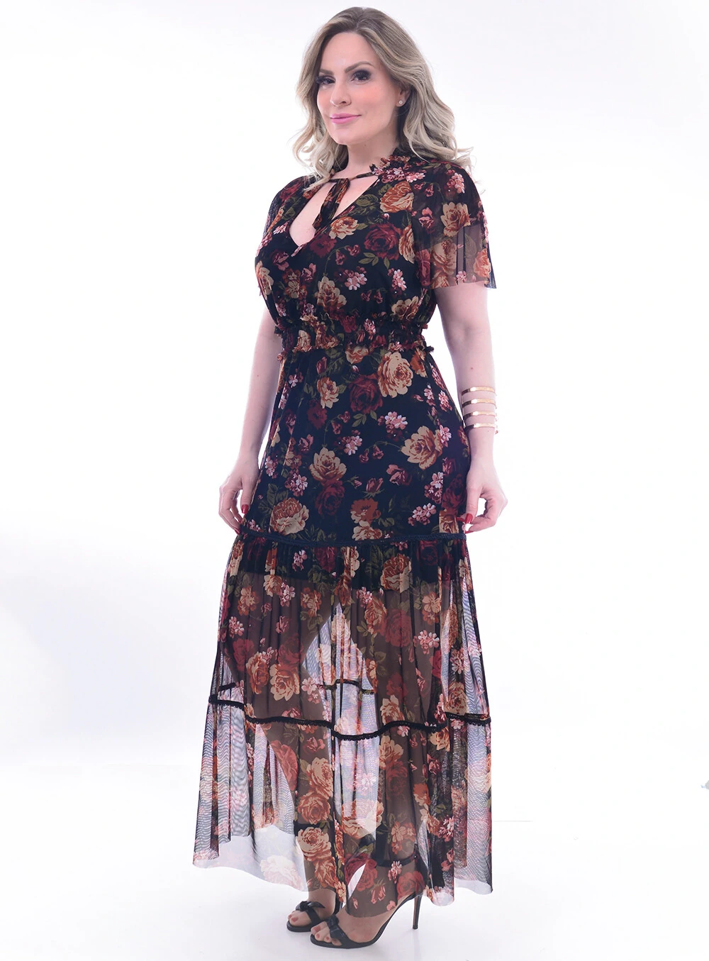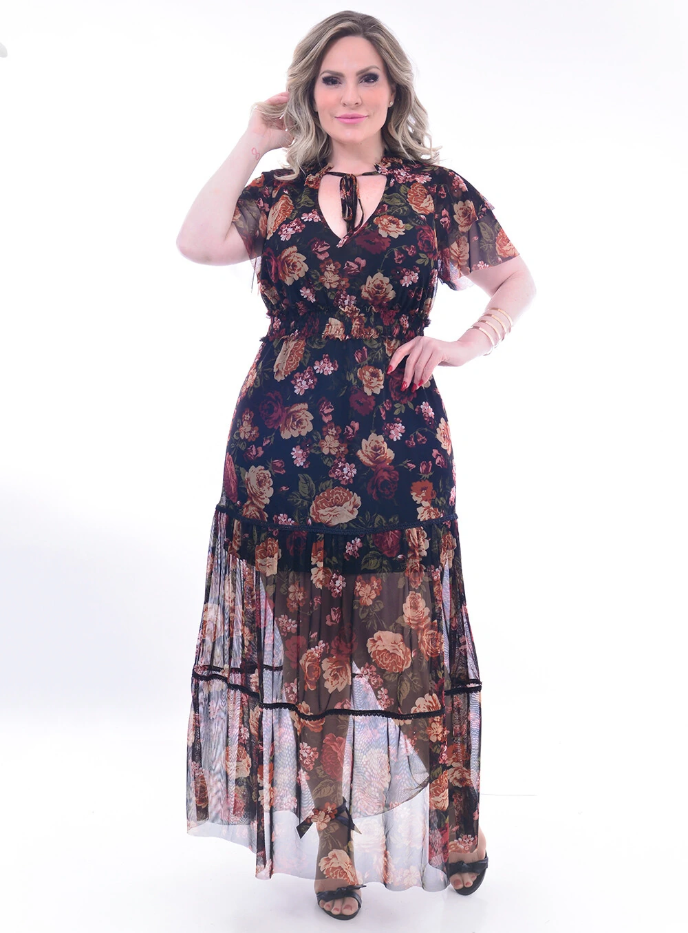 Vestido Longo Plus Size Decote V Laço nas Costas em Linho Misto