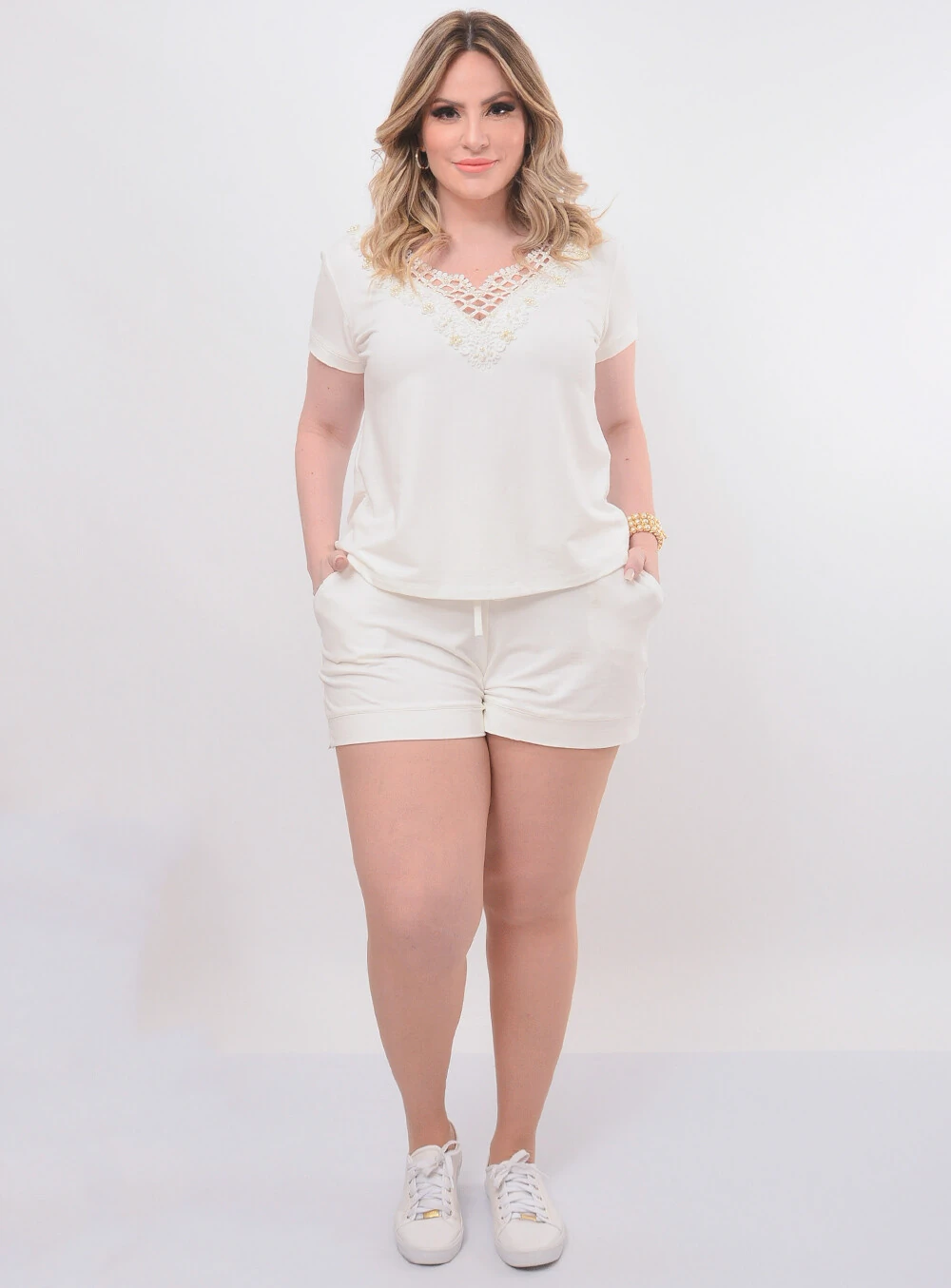 Blusa possui detalhe em renda e em pérolas.